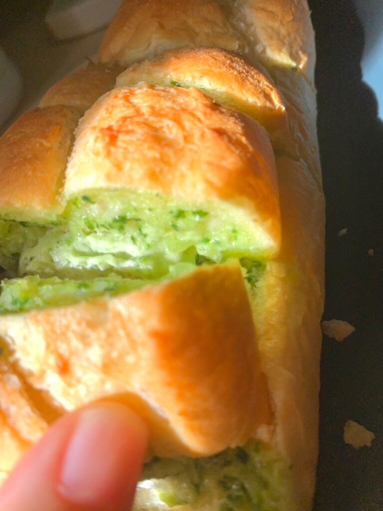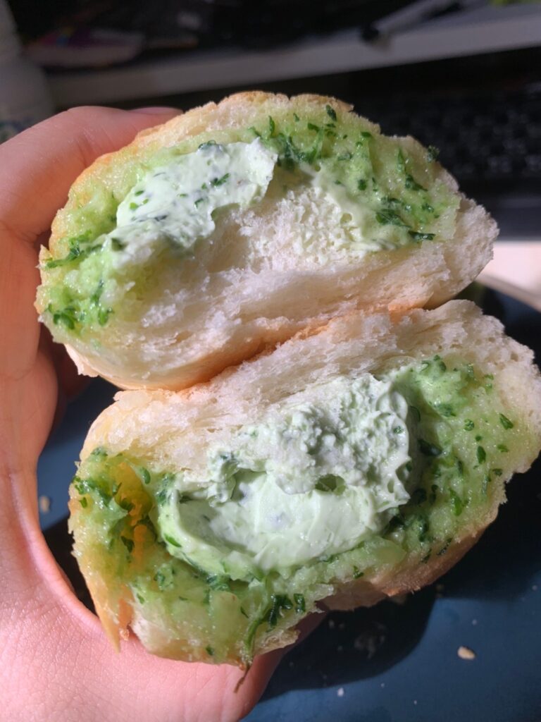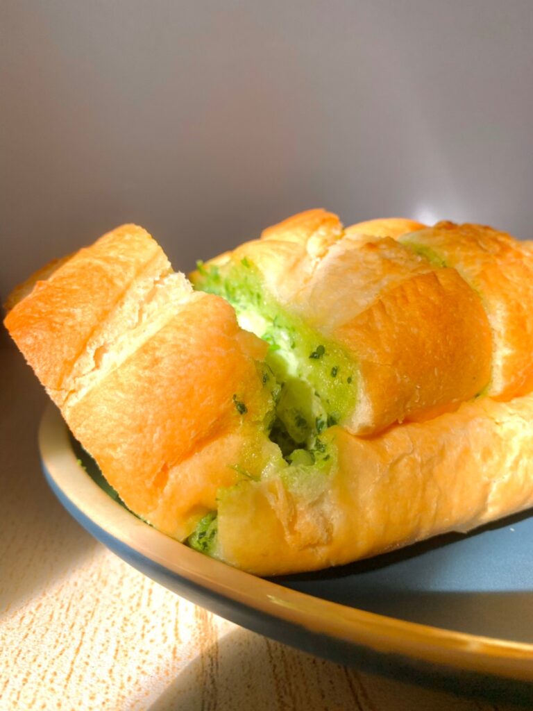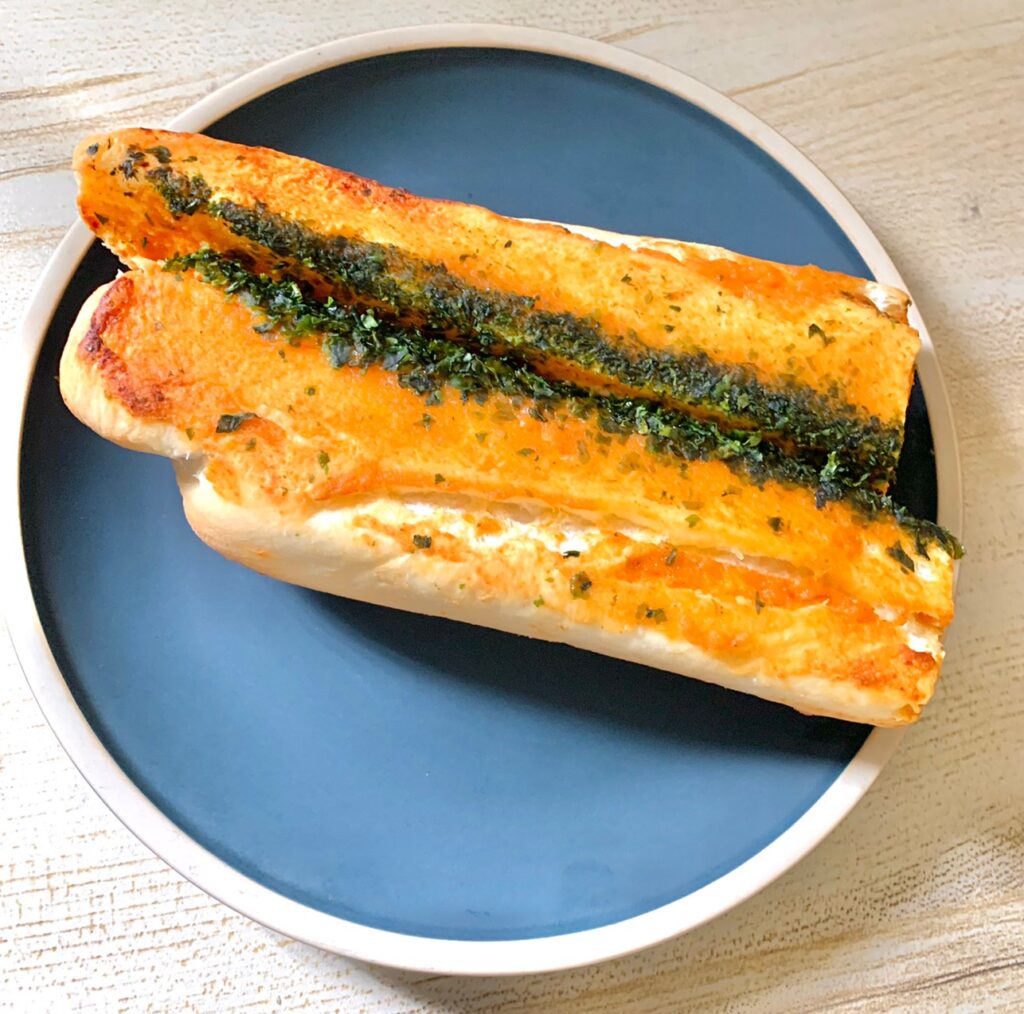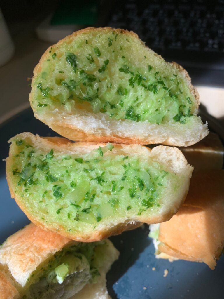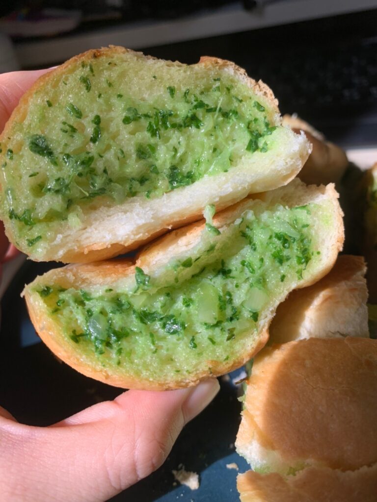 每一面都塗上很濃厚的巴西里(荷蘭芹)大蒜奶油醬,遇熱後的大蒜抹醬會在麵包裏頭化開來,香氣從烤箱裡逐漸蔓延開來,這個側面看起來真的很夢幻耶💖