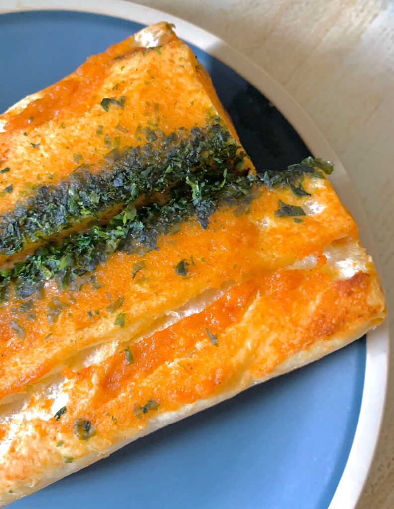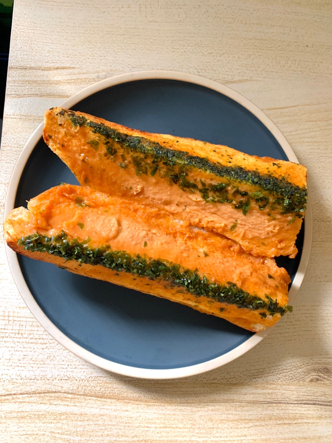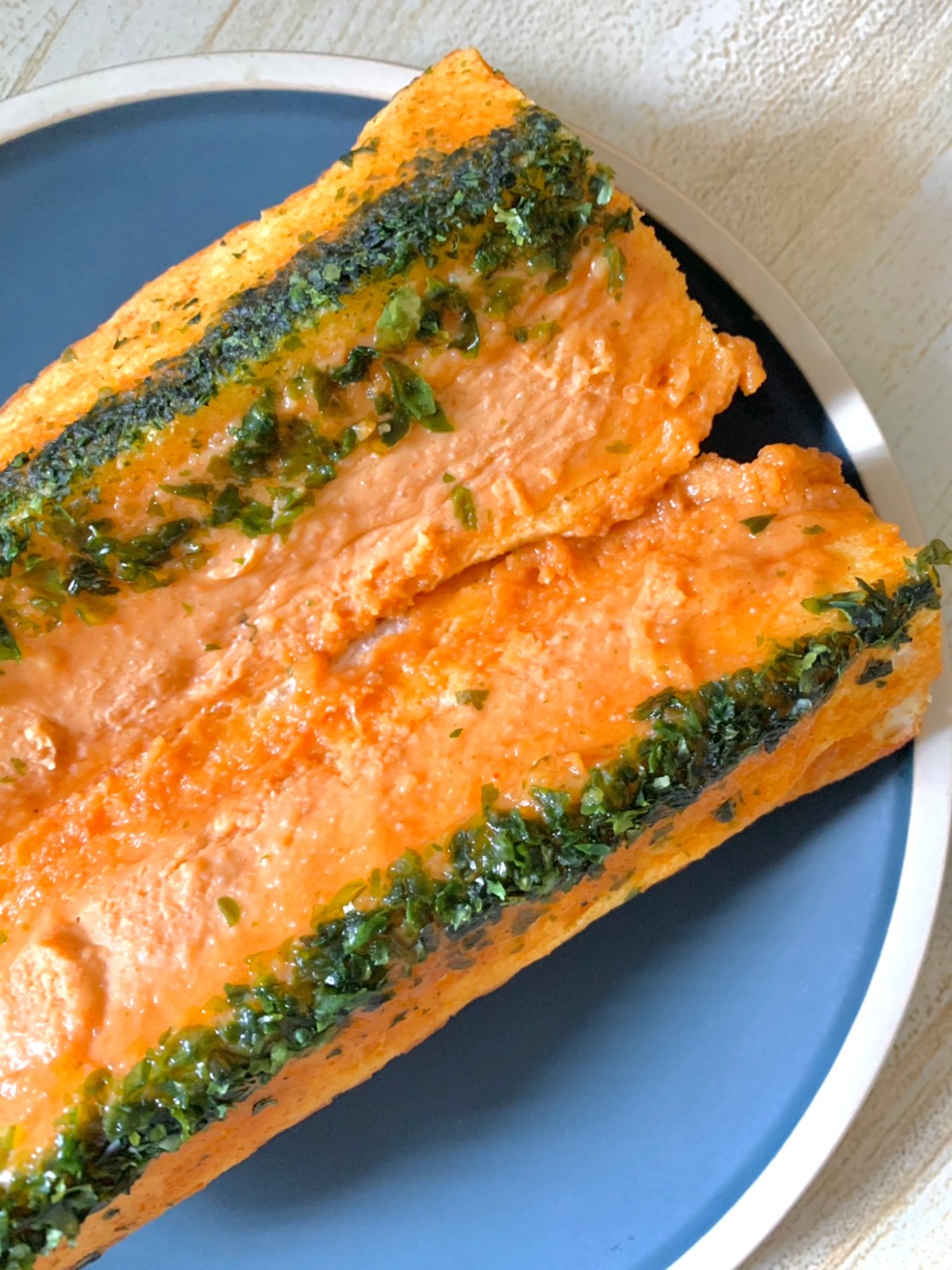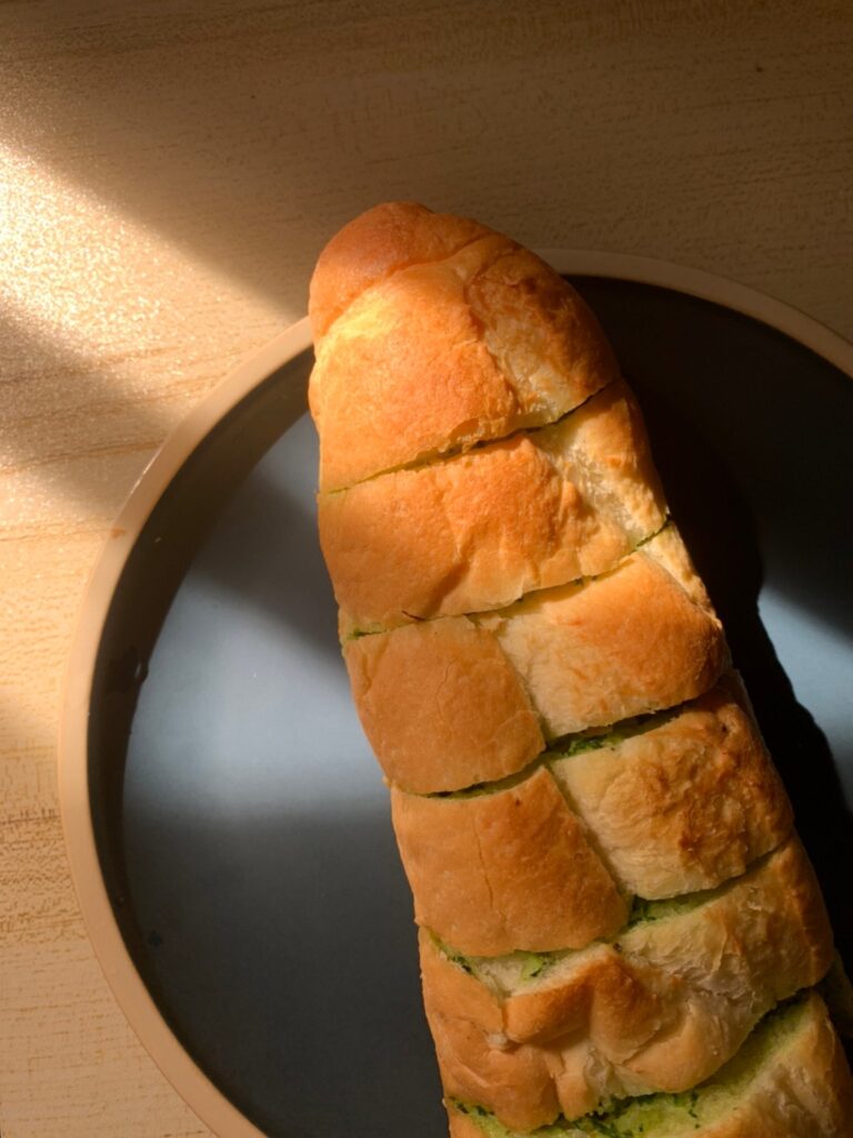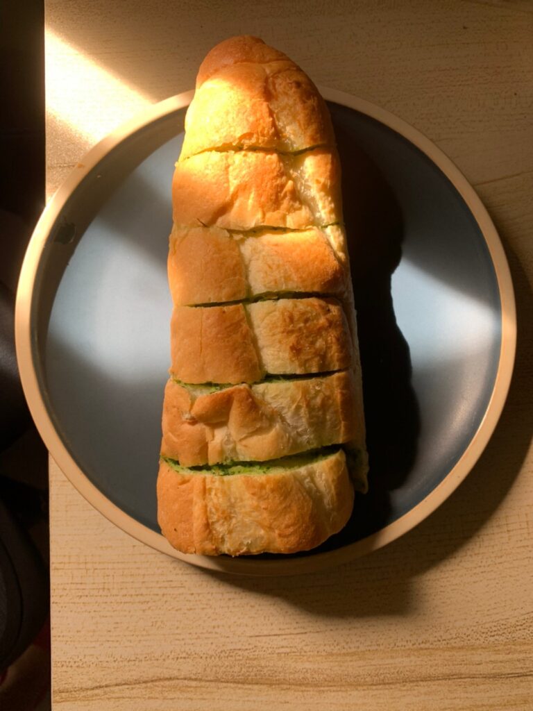 每一面都塗上很濃厚的巴西里(荷蘭芹)大蒜奶油醬,遇熱後的大蒜抹醬會在麵包裏頭化開來,香氣從烤箱裡逐漸蔓延開來,這個側面看起來真的很夢幻耶💖