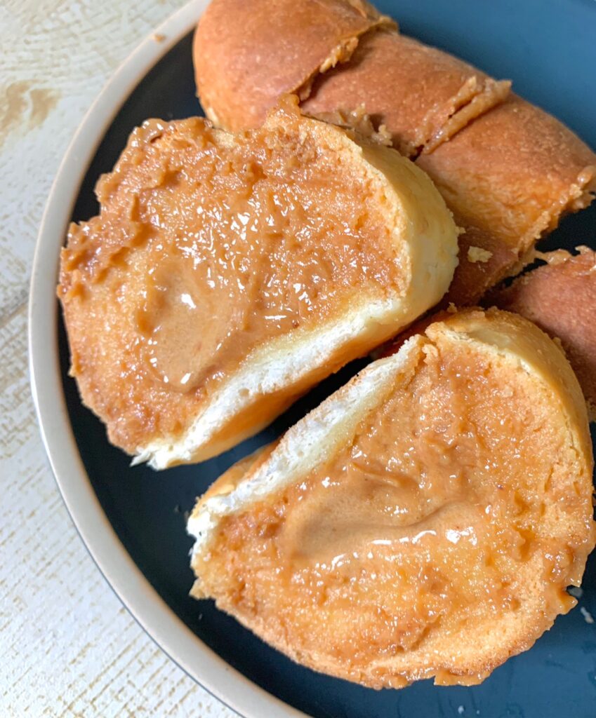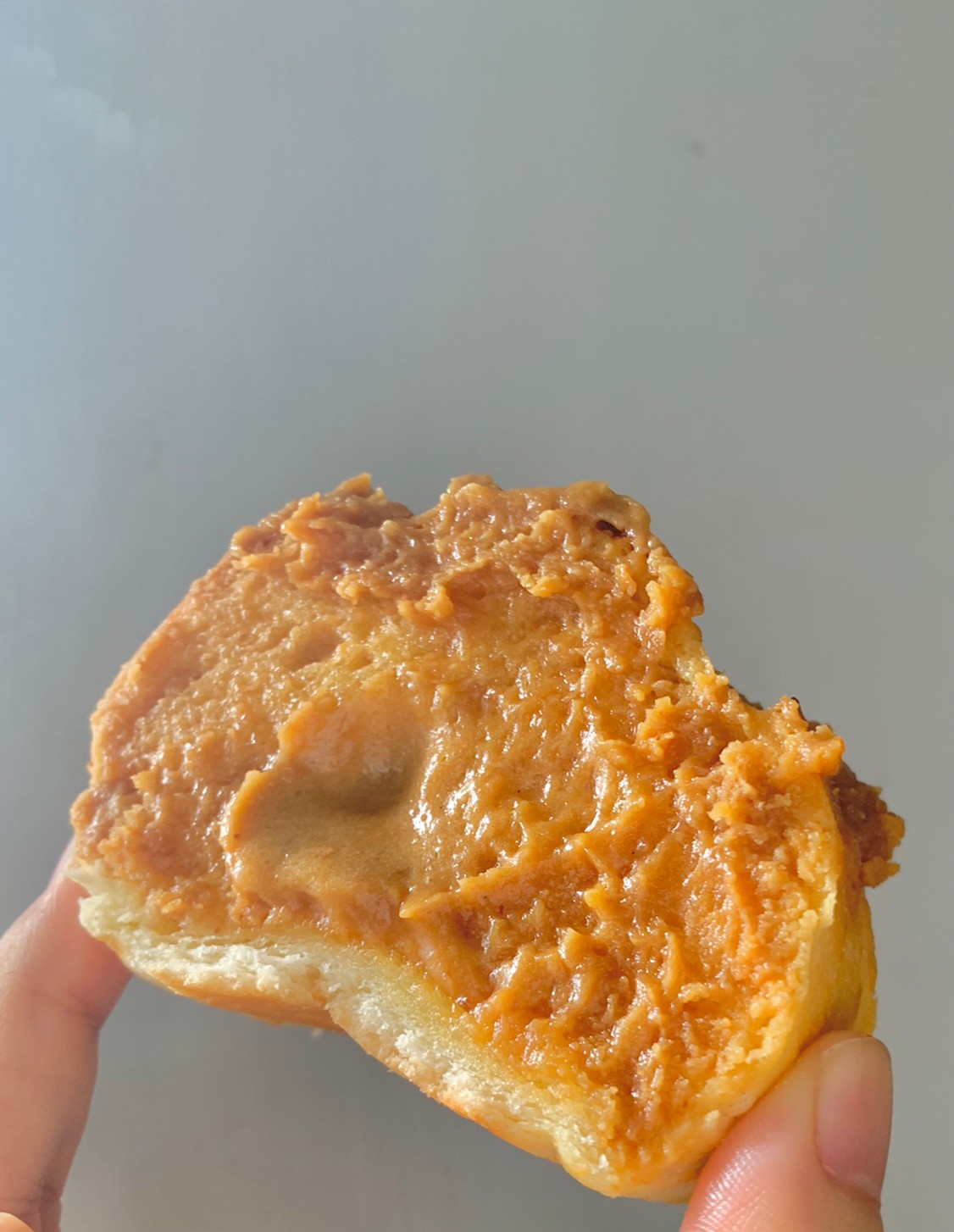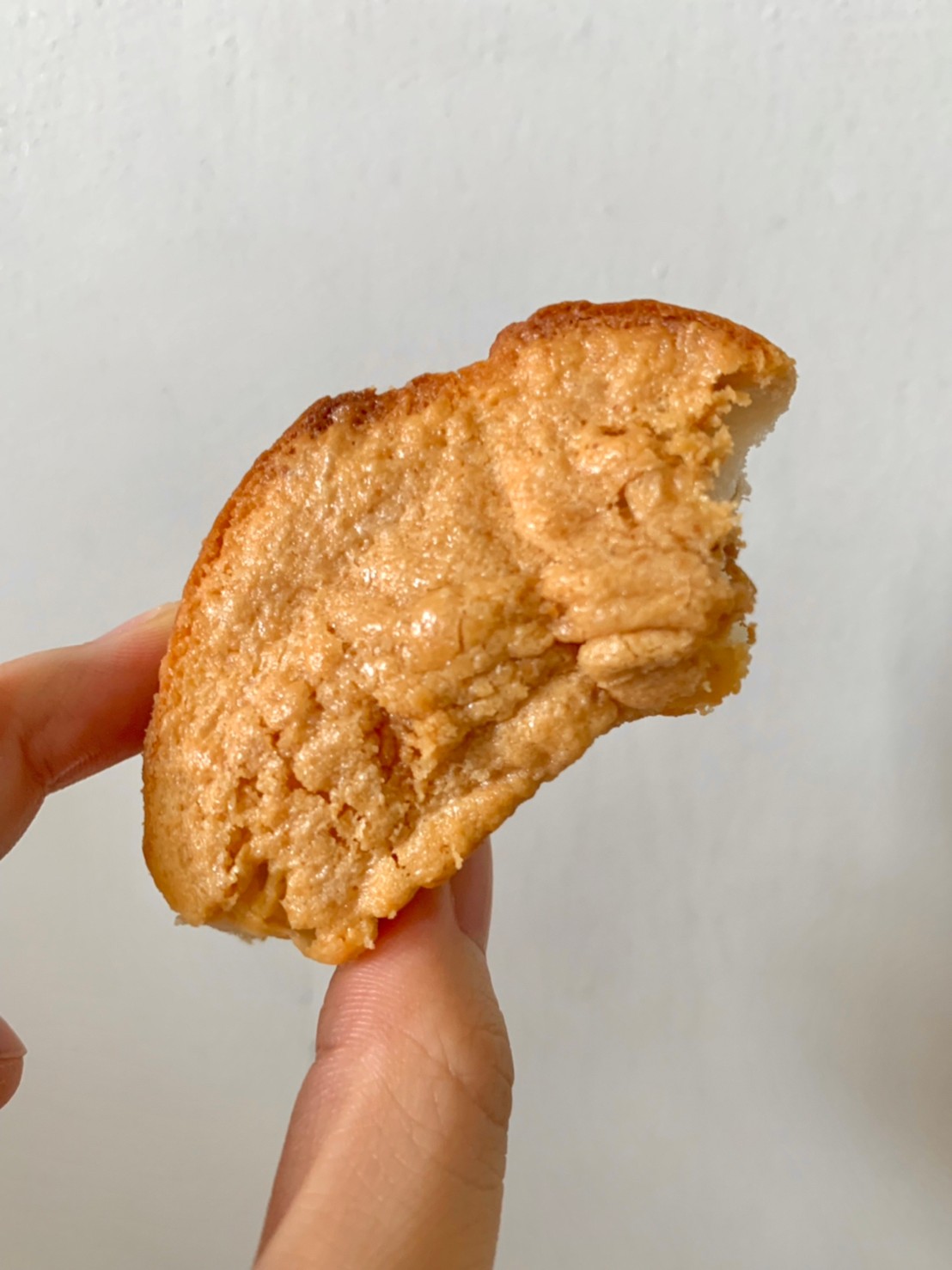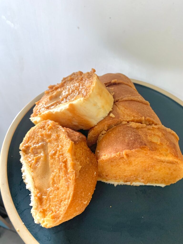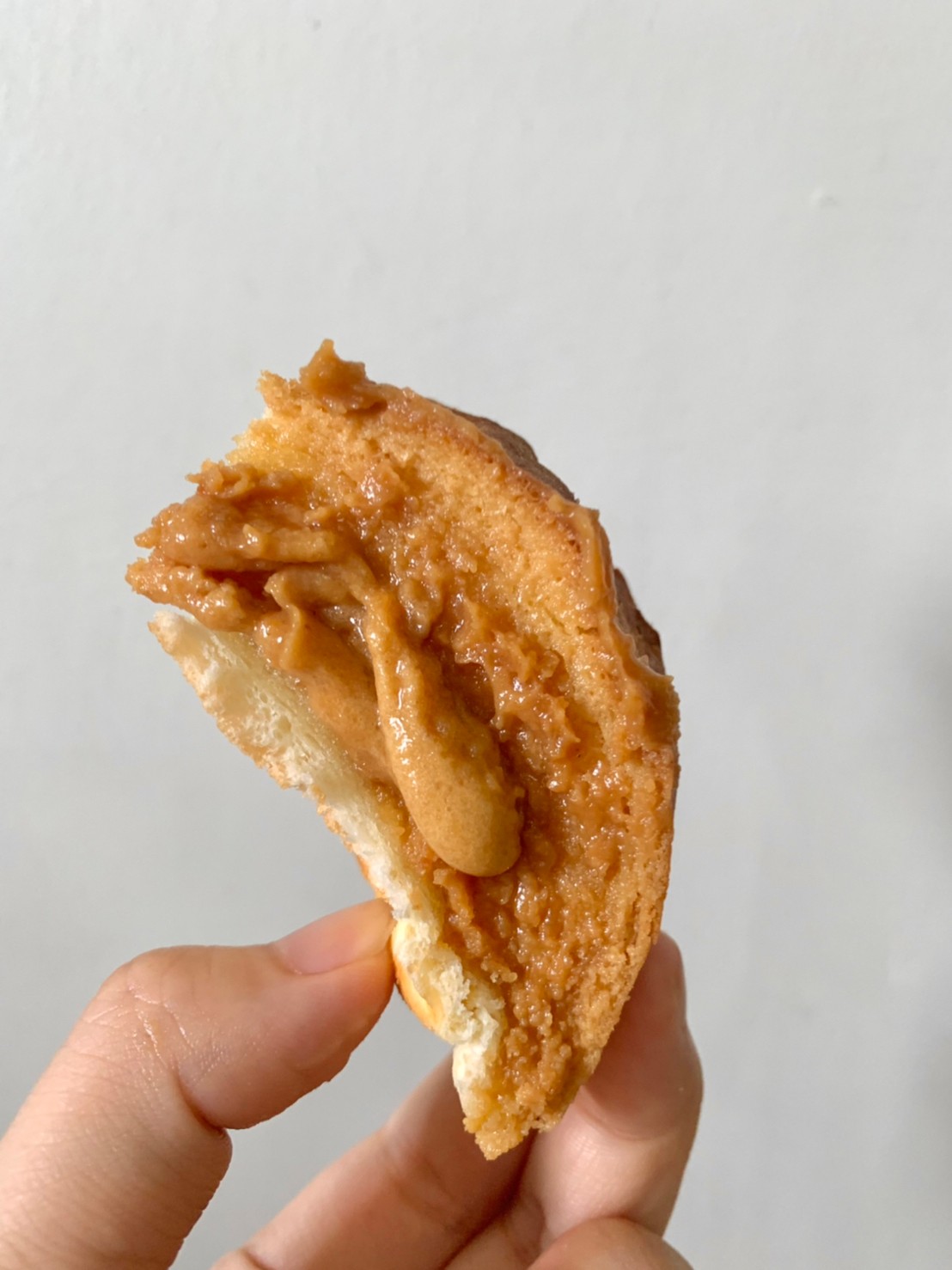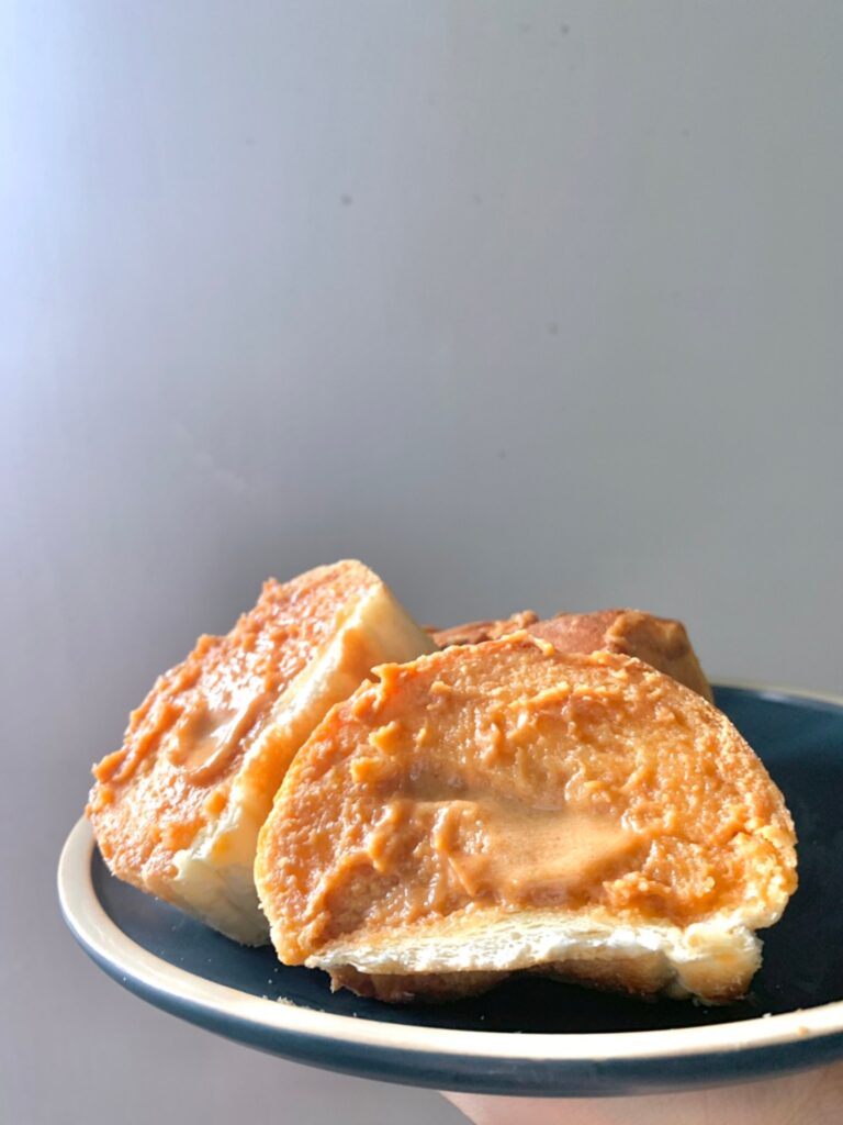 咬了一口的花生湯普斯側面圖,烤得比較乾的那面,花生醬會變得稍微脆脆的,而且醬真的超多的,咬了一口之後,醬直接被擠壓出來,有圖有真相,這花生醬含量真的很多,每一口都吃得到花生醬的👏一條也是大約可以切成5-6塊不等,一包內有三條喔~