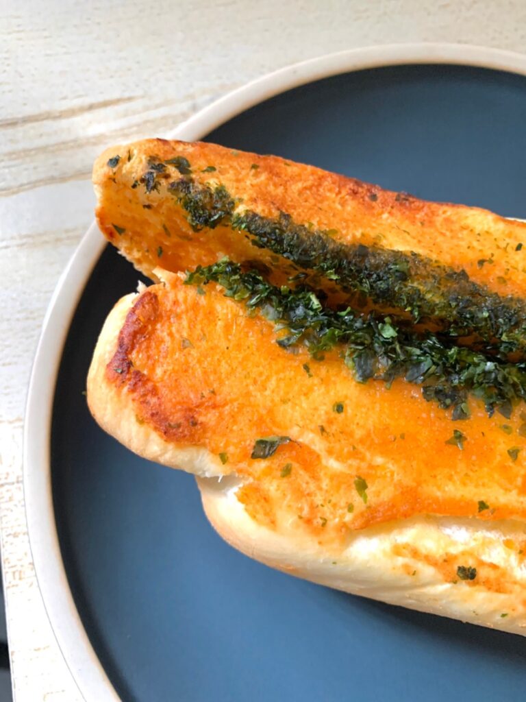 好吃的麵包在這裡!有一天朋友送了一包大蒜湯普斯到家裡,用著以藍色為底色帶點半透明的包裝,一包裡面有三條,看起來是蠻有份量的,拿出一條來烤看看,沒想到一吃就驚訝到不行!!太酥脆了吧!蒜味也超濃郁的😍