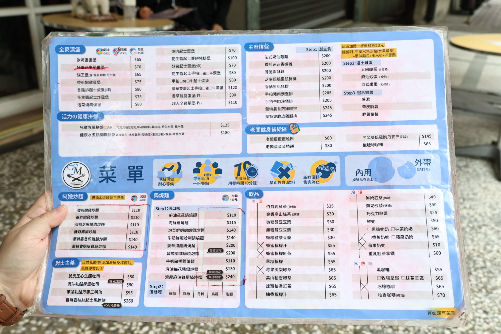 菜單有滿滿的選項,鹹甜蛋脆餅、手工捲餅、漢堡、小點心、帕尼尼、夾心吐司等,甚至還有鍋燒麵和炒麵的選項,飲品也有不少類型可選。