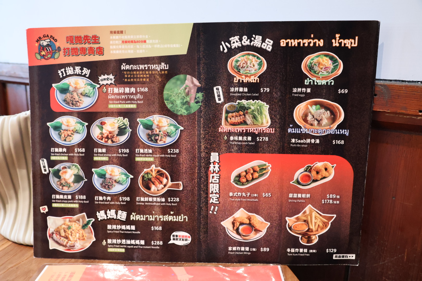 先來介紹一下第一面,主要有打拋系列、媽媽麵、小菜、湯品和員林店限定的小點。