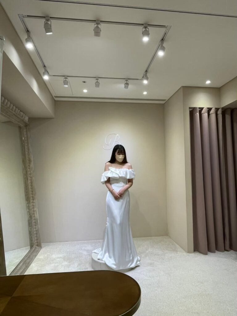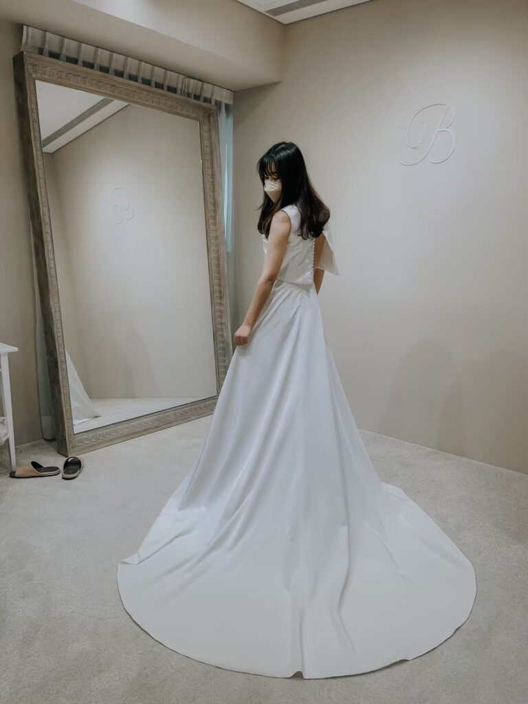 試穿時會有一個檯子,站在上面,讓禮服整體看起來更加有氣勢!!沒想到試婚紗也是一件很累人的事情,因為不同種類的穿法會不太一樣,不過多多超會穿的,只要站在裙子裡面三兩下就幫你穿好🤗