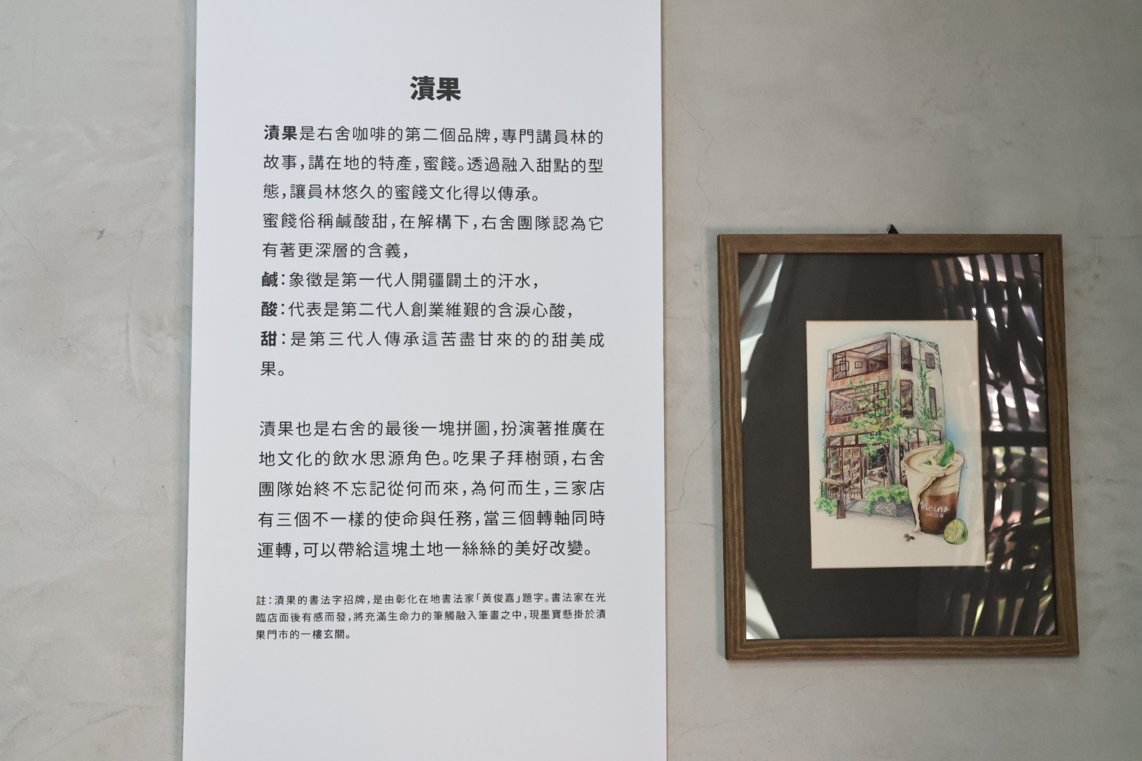 「員林鹹酸甜」十分知名,說到蜜餞必會想到員林,在地品牌「右舍咖啡」開了一間以蜜餞為主要食材的下午茶甜點店「漬果」,位置離右舍不遠,融合八個在地故事,有八道結合蜜餞的甜點。