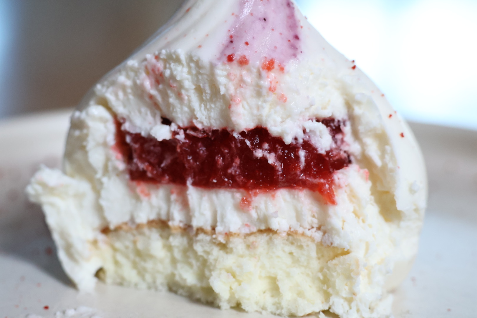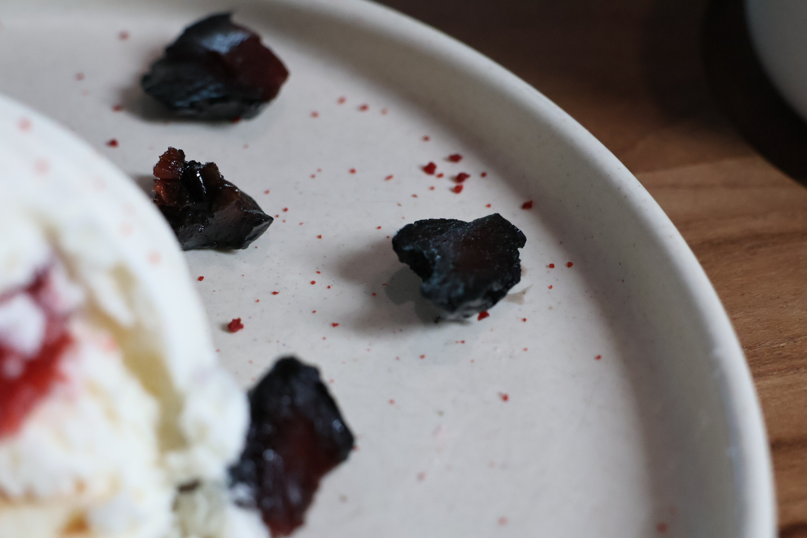 乳酪慕斯建議搭配化核應子一起吃,我覺得會更有層次感,化核應子的微甜與果香,平衡乳酪慕斯的濃郁口感,還能帶出一種獨特的口味對比,吃到中間還有果醬內餡,中西合併的感覺,非常豐富的味覺體驗!